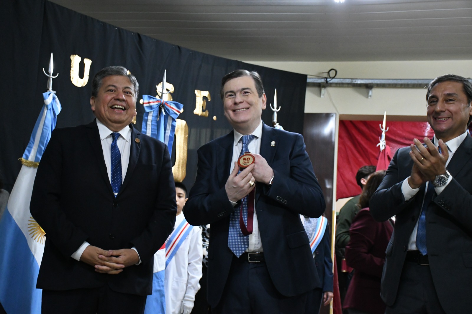 Durante la ceremonia, con la presencia de todo el alumnado, se hizo el descubrimiento de una placa recordatoria por haber sido la Escuela N° 407 la primera sede que acogió a la universidad. Además, el rector entregó al gobernador una medalla conmemorativa por los 50 años de la Unse, “como una muestra de nuestro agradecimiento por su permanente apoyo”.