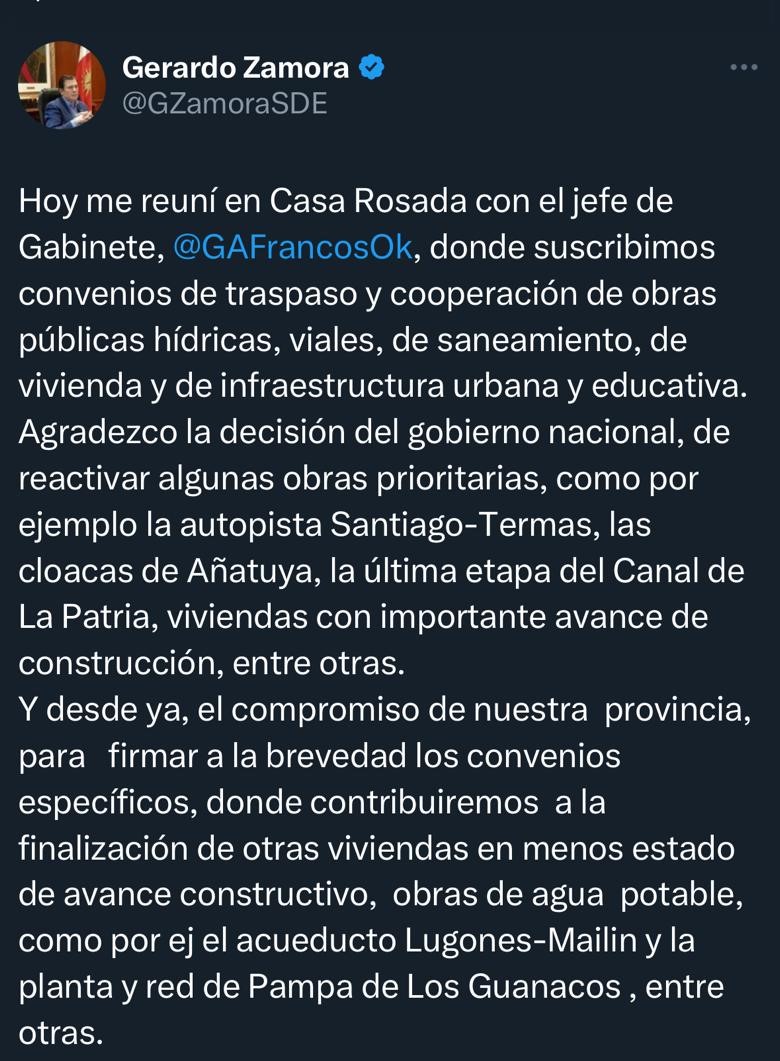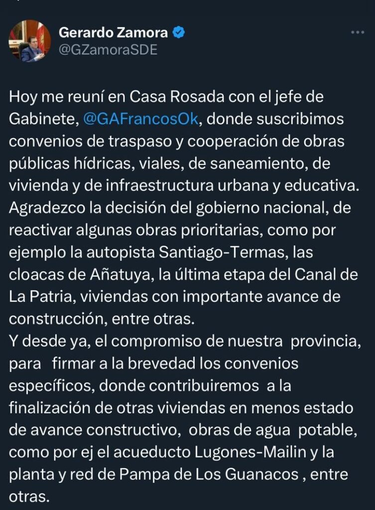 A través de sus redes sociales, el mandatario santiagueño detalló: “Hoy me reuní en Casa Rosada con el jefe de Gabinete, Guillermo Francos, donde suscribimos convenios de traspaso y cooperación de obras públicas hídricas, viales, de saneamiento, de vivienda y de infraestructura urbana y educativa”.